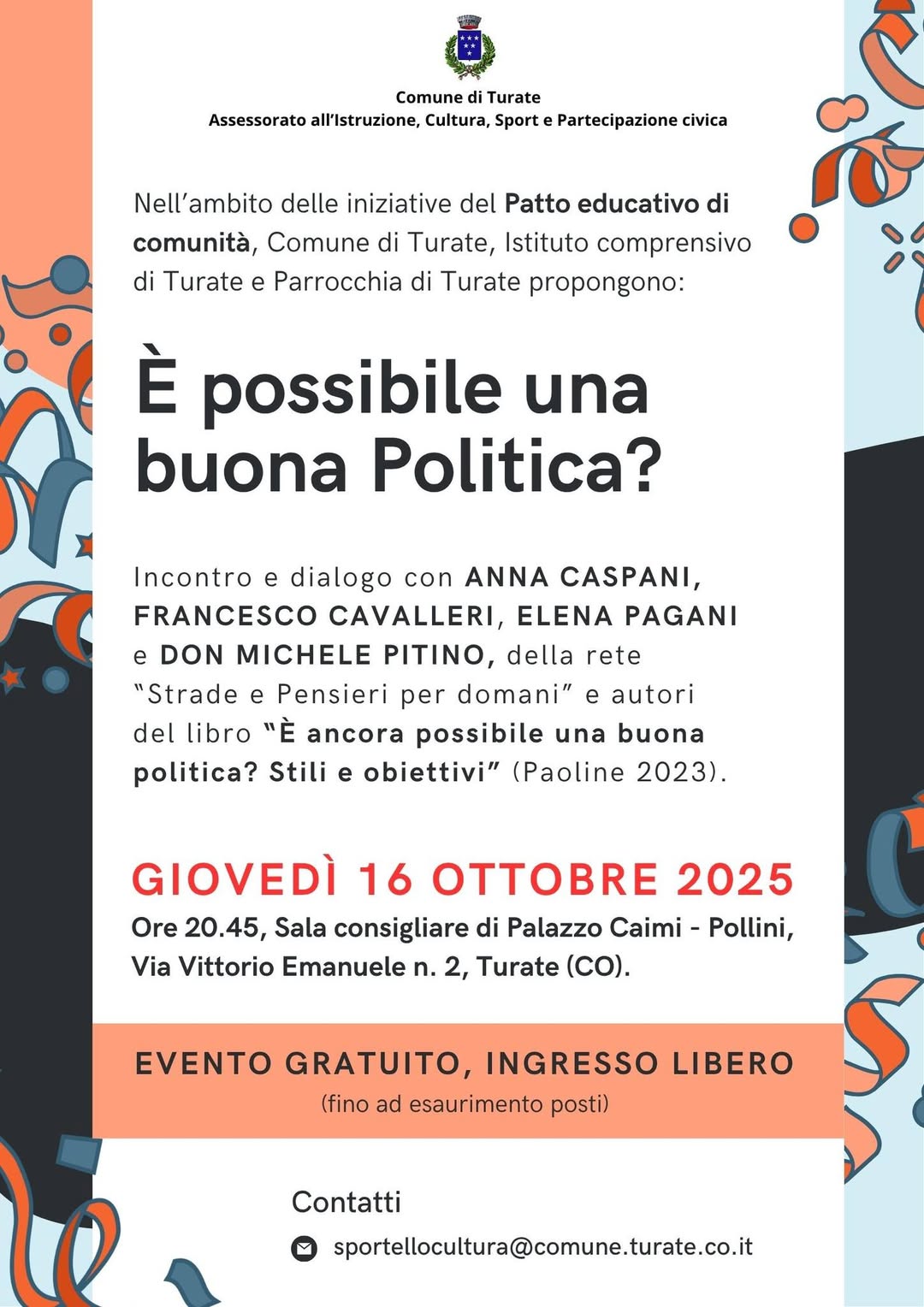 Il Comune di Turate – Assessorato all’Istruzione, Cultura, Sport e Partecipazione Civica è lieto di invitare la cittadinanza alla presentazione del libro “È ancora possibile la buona Politica? Stili e obiettivi”.